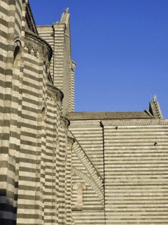 I was remembering coming up a narrow street in the small, mediaeval hilltop town of Orvieto in Umbria: I lifted my eyes and saw the most confoundingly beautiful structure – a striped cathedal, with intricate, delicate relief carvings on the capitals with sumptuous cornerstones. It may not be the biggest and the best in the world – but this striped beauty captured my imagination.